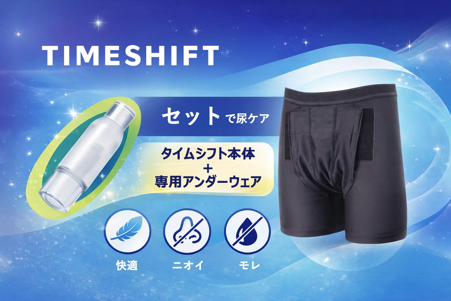 尿で膨らんだタイムシフトを正しい位置で支え、スムーズな排尿をサポート。タイムシフト使用時は、着用が必須となります。
